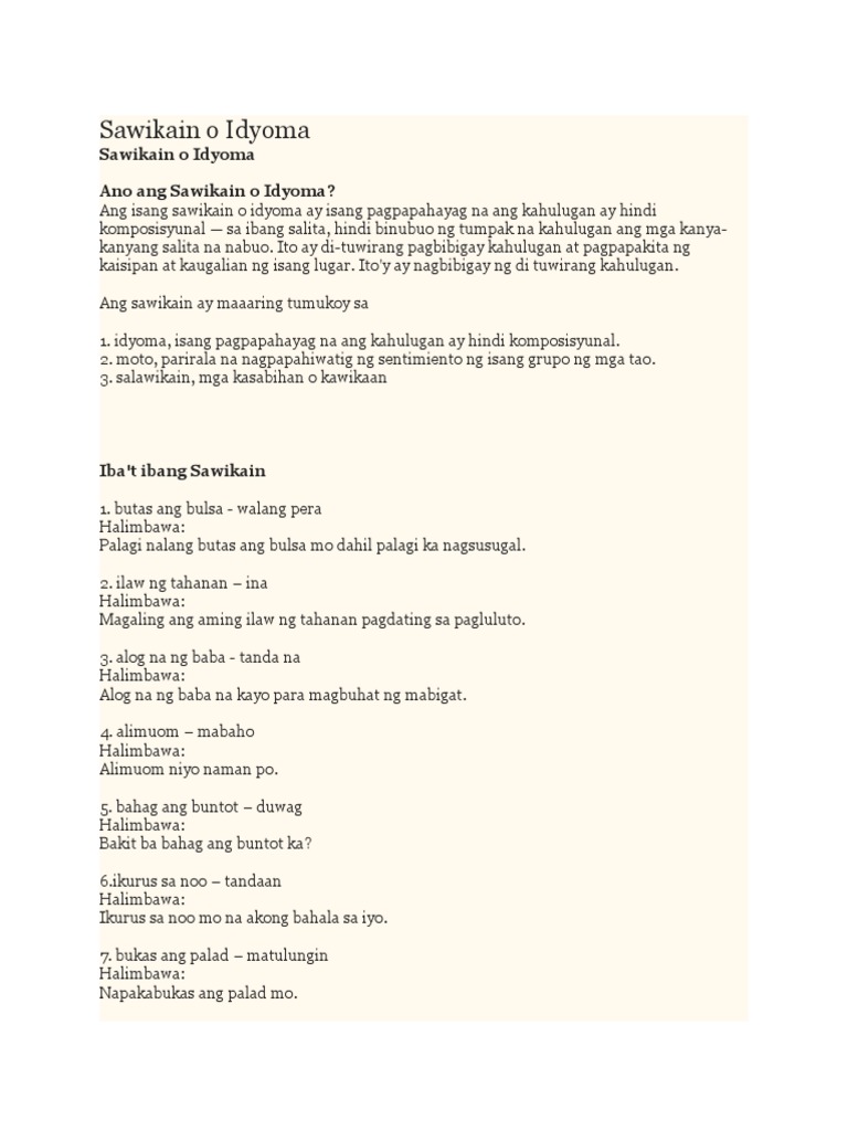 85 Na Mga Halimbawa Ng Mga Idiyoma O Sawikain