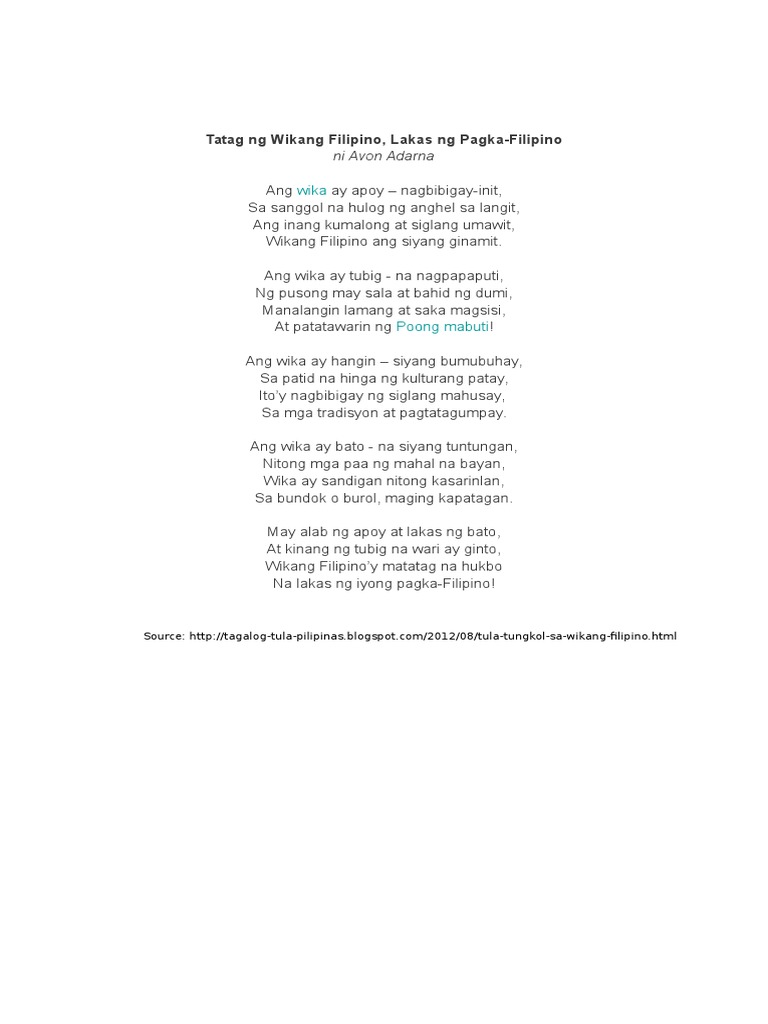 8082017 Tatag ng Wikang Filipino Lakas ng Pagka-Filipino ni. Browse for Ang Wika Ay Tubig Na Nag Papauti Ng Pusong May Sala song lyrics by entered search phrase. Avon Adarna Ang wika ay apoy nagbibigay-init Sa sanggol na hulog ng anghel sa langit Ang inang kumalong at siglang umawit Wikang Filipino ang siyang ginamit.