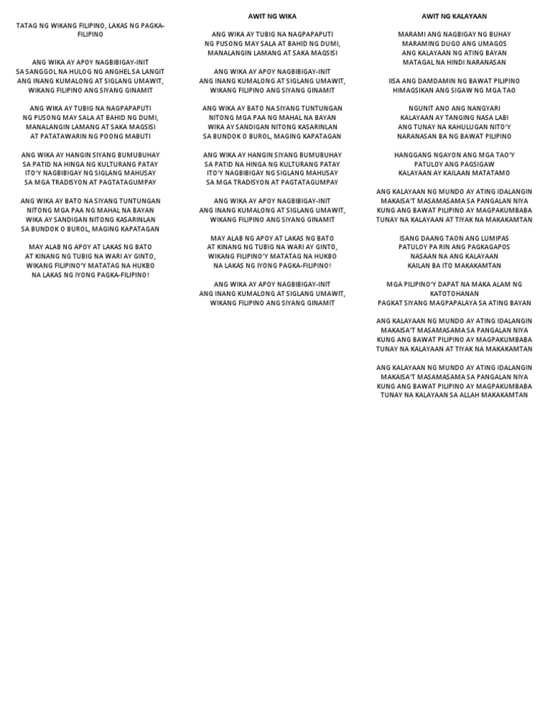 Ang wika ay tubig na nagpapaputi ng pusong may sala. Patuloy na hahalimuyak ang Wikang Filipino hanggang sa katapusan ng mundo. Ang wika ay hangin siyang bumubuhay Sa patid na hinga ng kulturang patay Itoy nagbibigay ng siglang mahusay Sa mga tradisyon at pagtatagumpay. Wikang Filipino Wikang Pambansa.