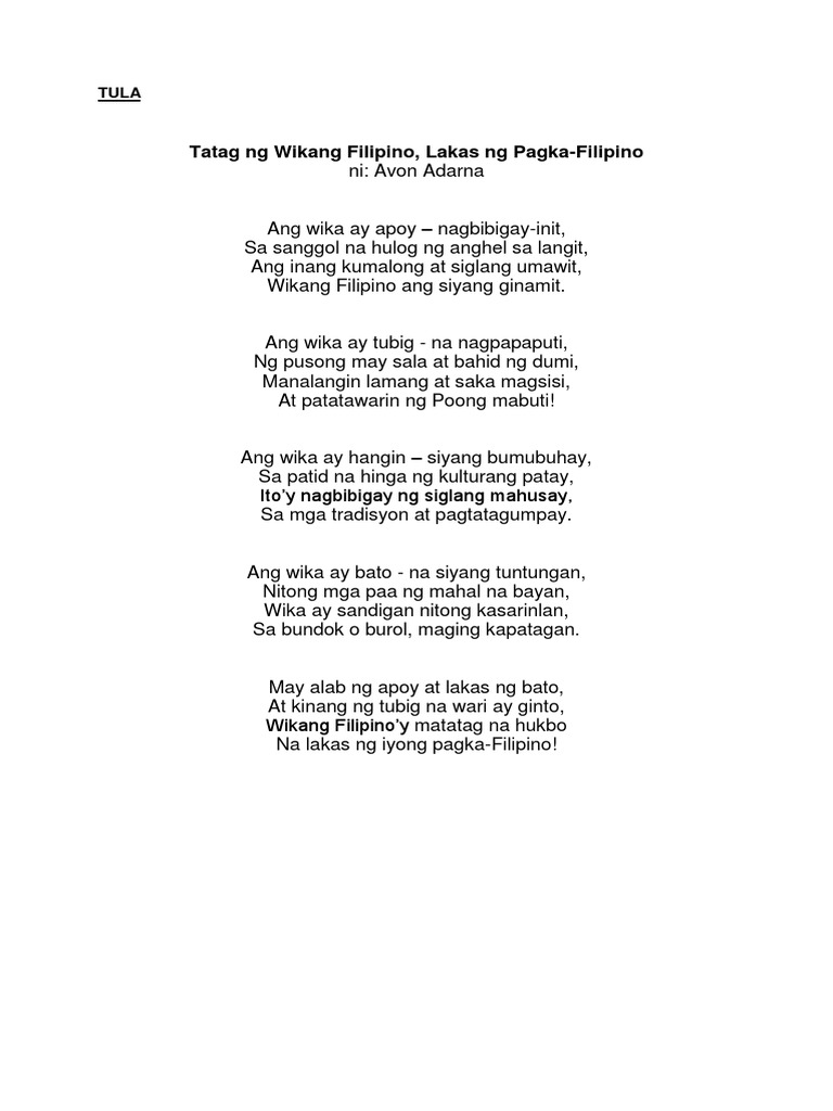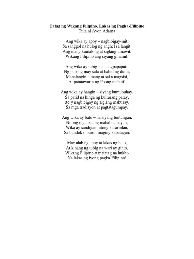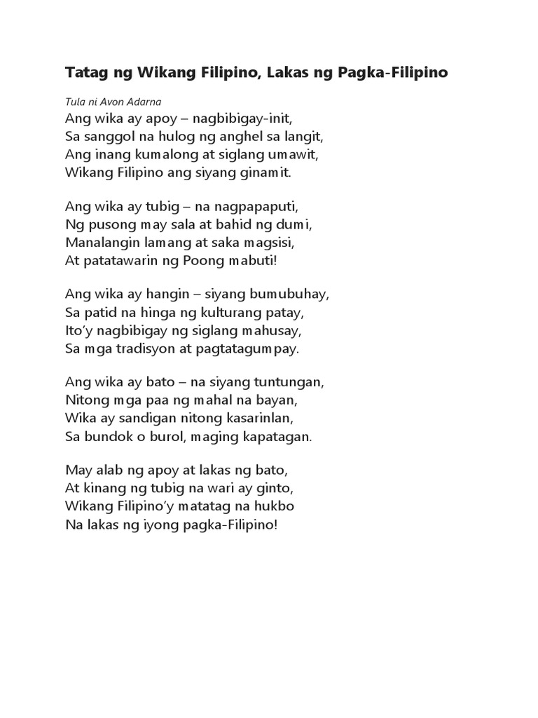 Ang Awit ng Wika Ni Avon Adarna titik at Tishie Subido musika Ang wika ay tubig na nagpapaputi ng pusong may sala at bahid ng dumi Manalangin lamang at saka magsisisi At patatawarin ng Poong mabuti Ang wika ay apoy - nagbibigay init Sa sanggol na hulog ng anghel sa langit Ang inang kumalong at siglang umawit Wikang Filipino ang siyang ginamit Ang wika ay bato - na. Ang wika ay bato na siyang tuntungan nitong mga paa ng mahal na bayan Wika ay sandigan. Ang wika ay hangin siyang bumubuhay Sa patid na hinga ng kulturang patay Itoy nagbibigay ng siglang mahusay Sa mga tradisyon at.