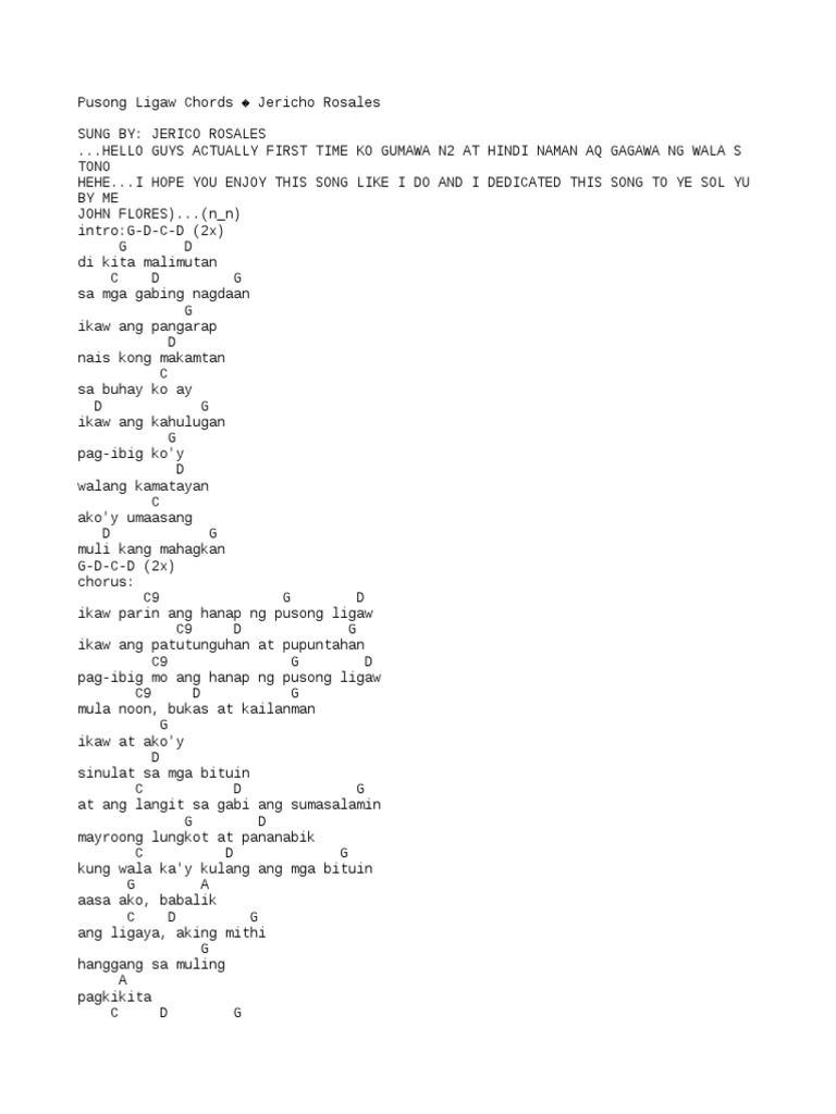 Ikaw ang patutunguhan at pupuntahan. JERICO ROSALES HELLO GUYS ACTUALLY FIRST TIME KO GUMAWA N2 AT HINDI NAMAN AQ GAGAWA NG WALA S TONO HEHEI HOPE YOU ENJOY THIS SONG LIKE I DO AND I DEDICATED THIS SONG TO YE SOL YU BY ME JOHN FLORESn_n Intro G-D-C-D 2x Verse G D di kita malimutan C D G sa mga gabing nagdaan G ikaw ang pangarap D nais kong makamtan C sa buhay ko ay D G ikaw ang. Mula noon bukas at kailanman.