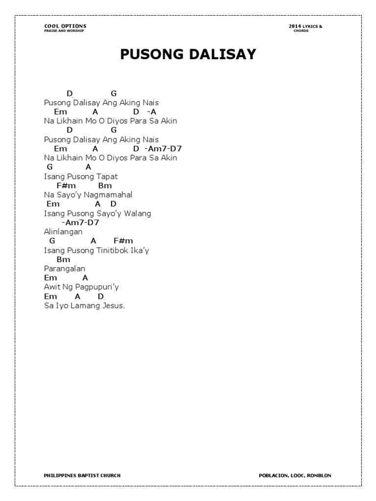 Pusong Dalisay - Royal Philharmonic Orchestra Lyrics and Chords Download button is at the bottom. Favoritemusic_note Chords for PUSONG DALISAY Tagalog Christian Song share. A D PUSONG DALISAY ANG AKING NAIS Bm E A E NA LIKHAIN MO OH DIYOS PARA SA AKIN A D PUSONG DALISAY ANG AKING NAIS Bm E A A7 NA LIKHAIN MO OH DIYOS PARA SA AKIN CHORUS D E Cm Fm ISANG PUSONG TAPAT NA SAYOY.
