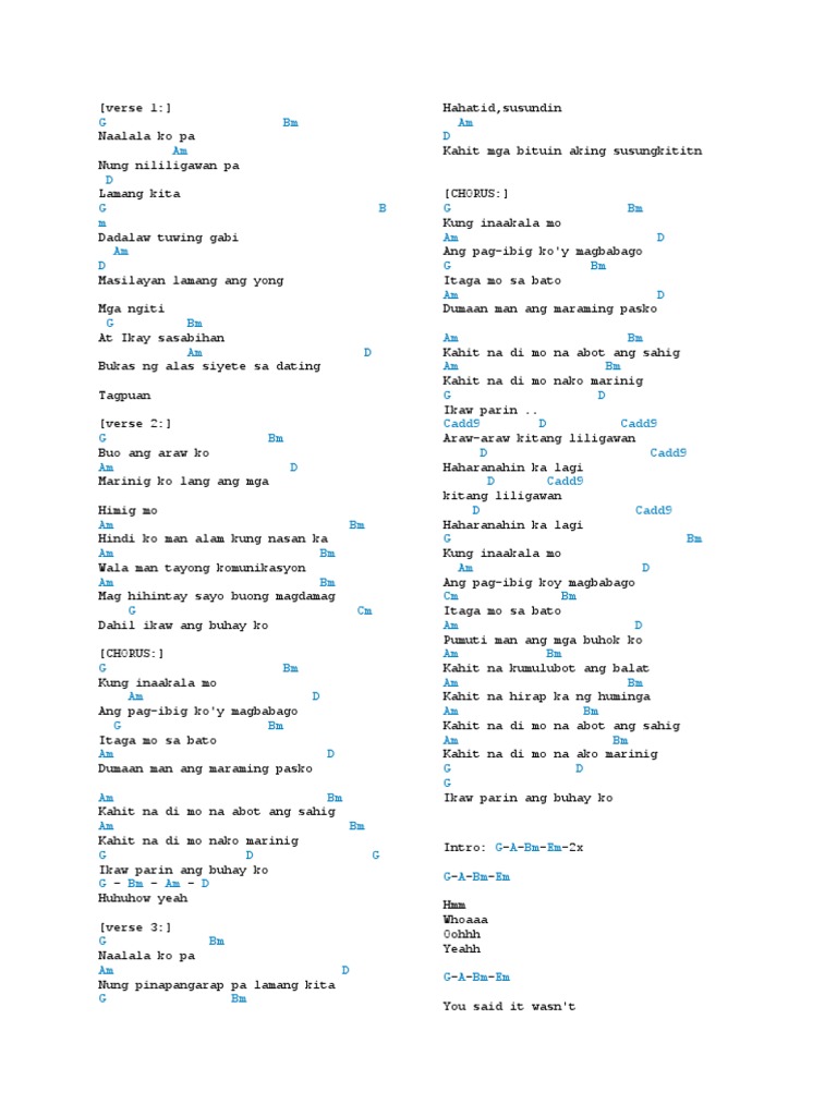 STANDARD TUNING Intro G A G A Verse 1 D G Nang ikay ibigin ko A D Mundo koy biglang nagbago D G Akala ko ikay langit A D Yun palay sakit ng ulo D G Sabi mo noon sa.